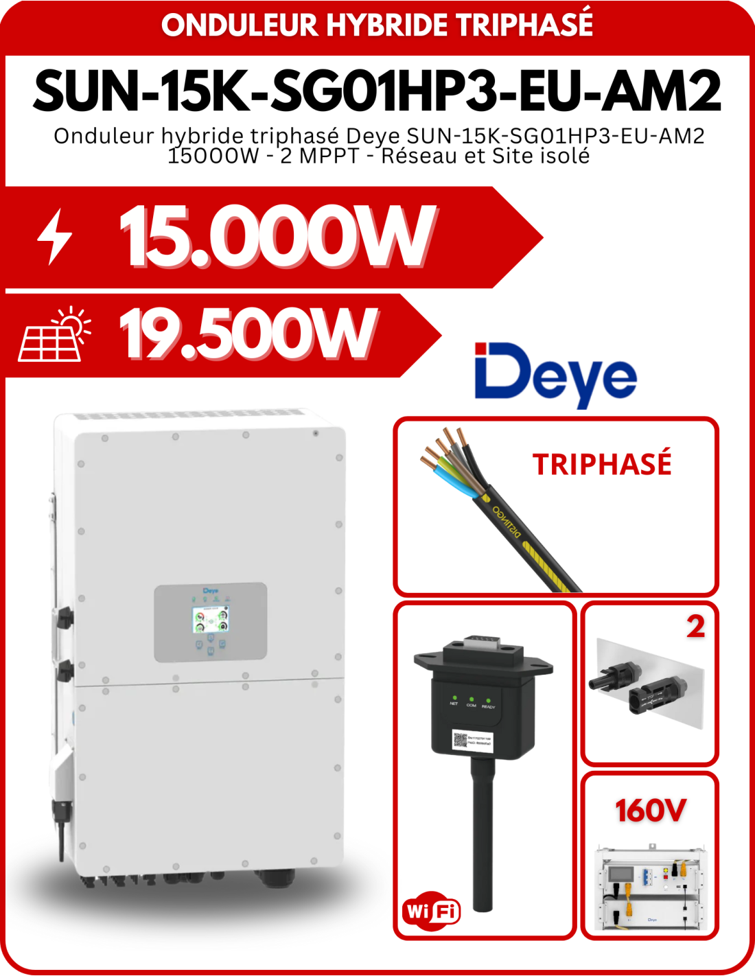 Onduleur hybride triphasé Deye SUN-15K-SG01HP3-EU-AM2 15000W - 2 MPPT - Réseau et Site isolé