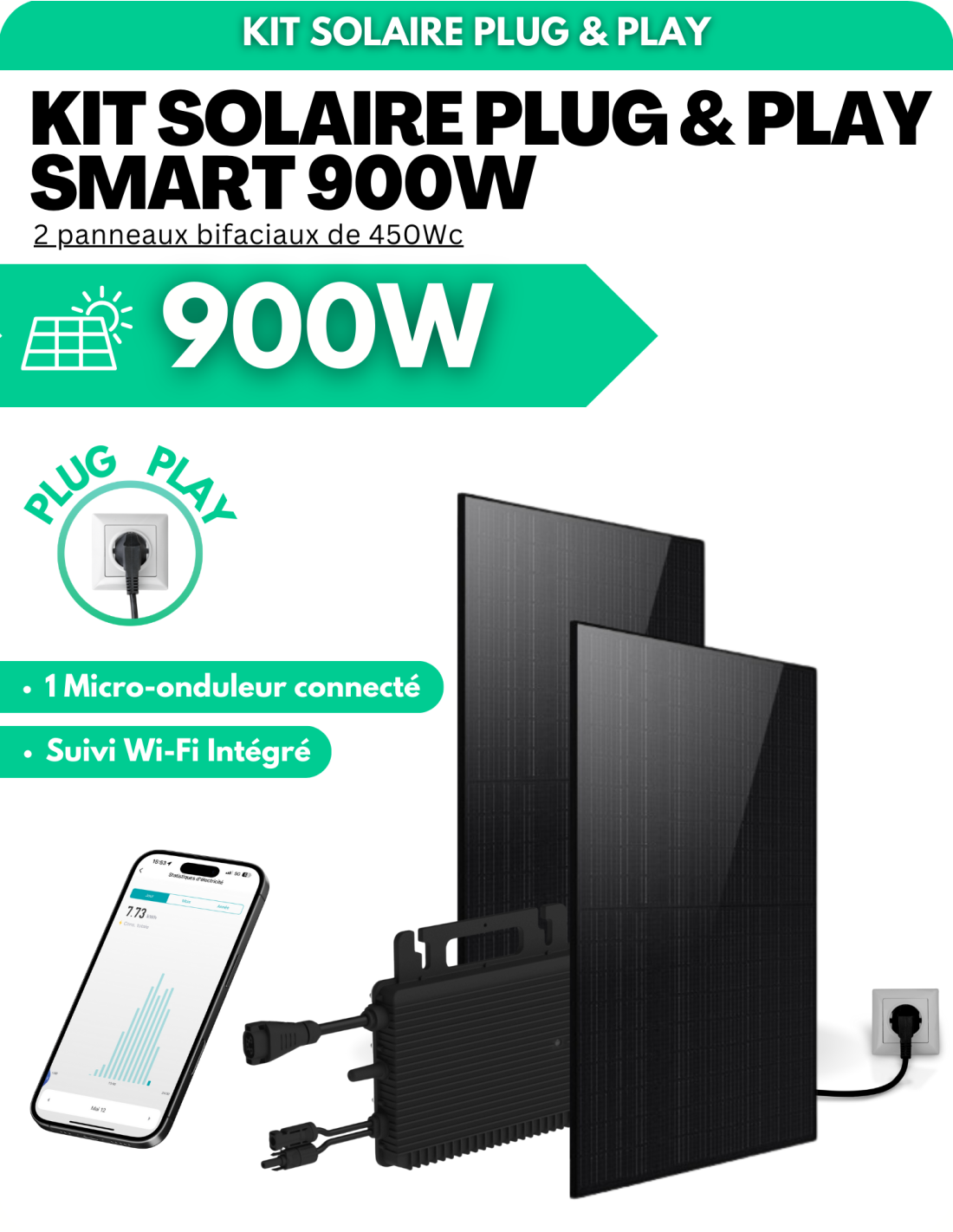 Kit solaire Plug & Play 1000W - 2 panneaux bifaciaux - Suivi WIFI intégré