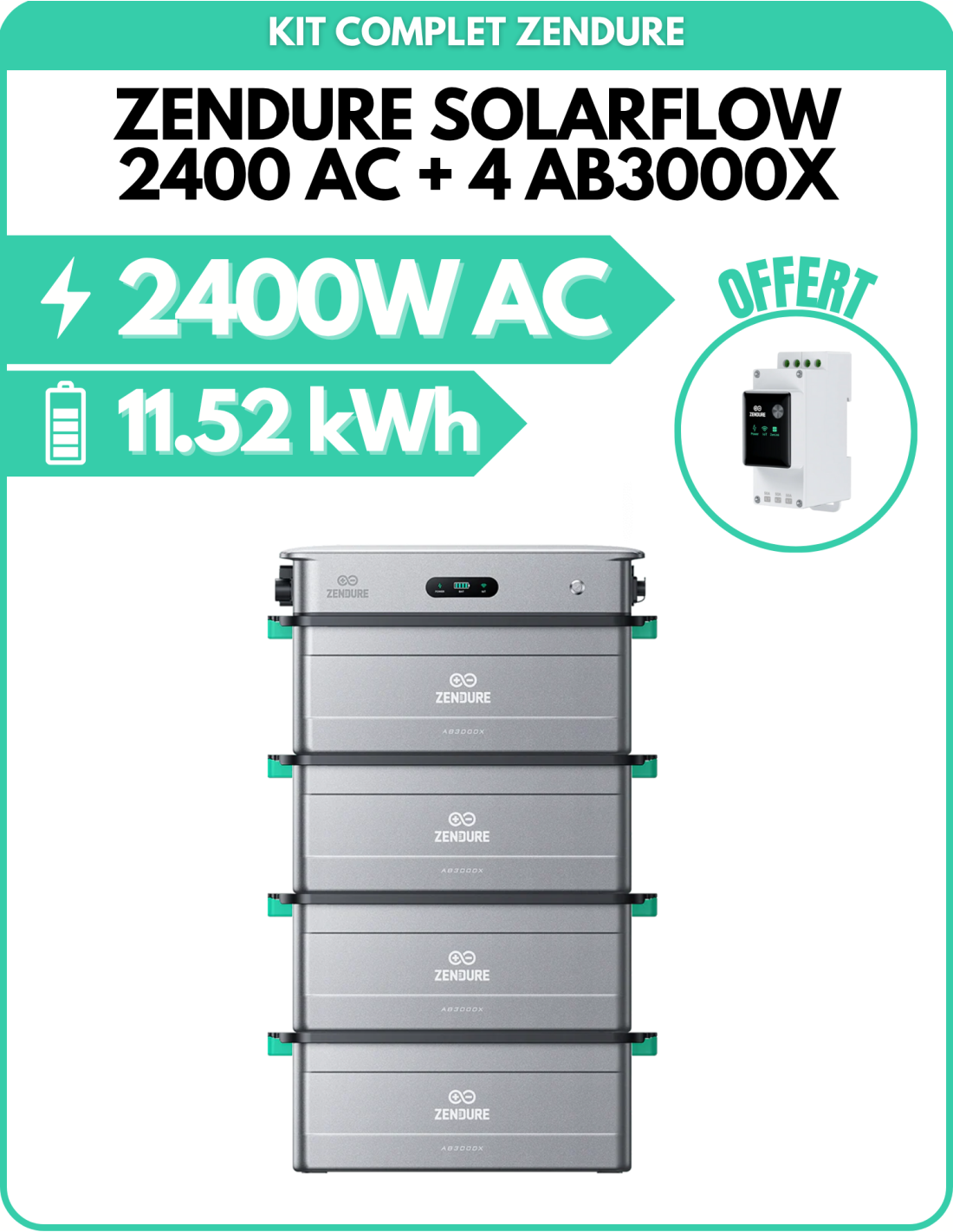 Le kit Zendure SolarFlow 2400 est la solution idéale pour maximiser votre autoconsommation solaire sans complexité. Composé du boîtier SolarFlow 2400 AC et d’une ou plusieurs batteries lithium AB3000X, il permet d'utiliser l’énergie solaire en direct pendant la journée, puis de puiser dans la batterie le soir venu.